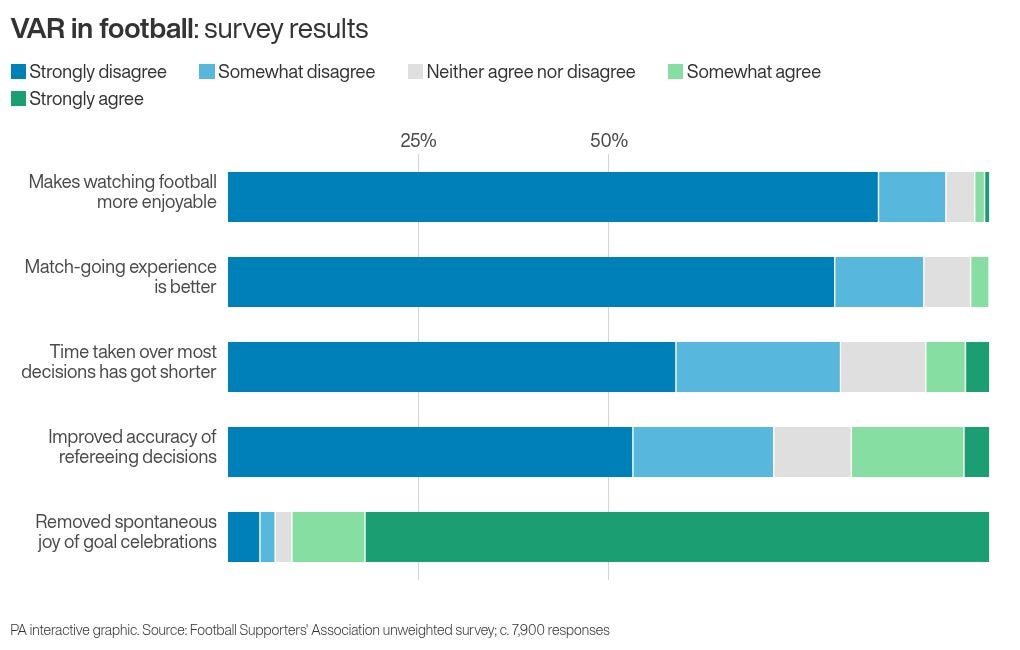 The results demonstrate just how unpopular it has become, with more than 97 per cent of respondents opposing the statement that VAR makes watching football more enjoyable, while more than 90 per cent disagree that it has made the matchgoing experience better.