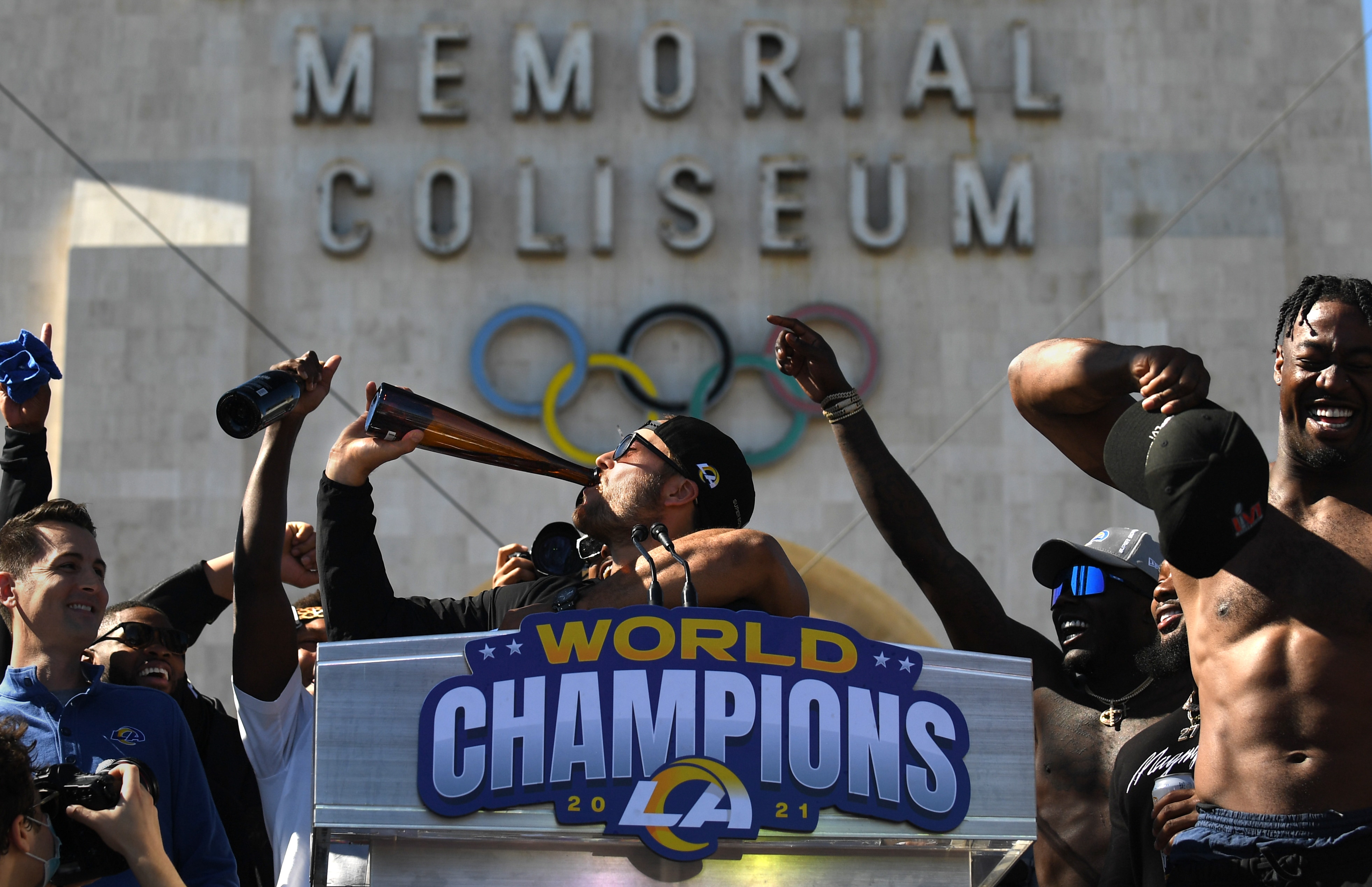 Fans lined sidewalks along the mile-long parade route in Los Angeles as team members passed around the Lombardi Trophy, chugged champagne and waved from open-top double-decker buses that rolled to a plaza outside Los Angeles Memorial Coliseum.