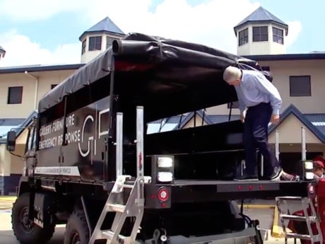 The truck can drive through 55 inches of water, has heating, air conditioning and hydraulic lifts.