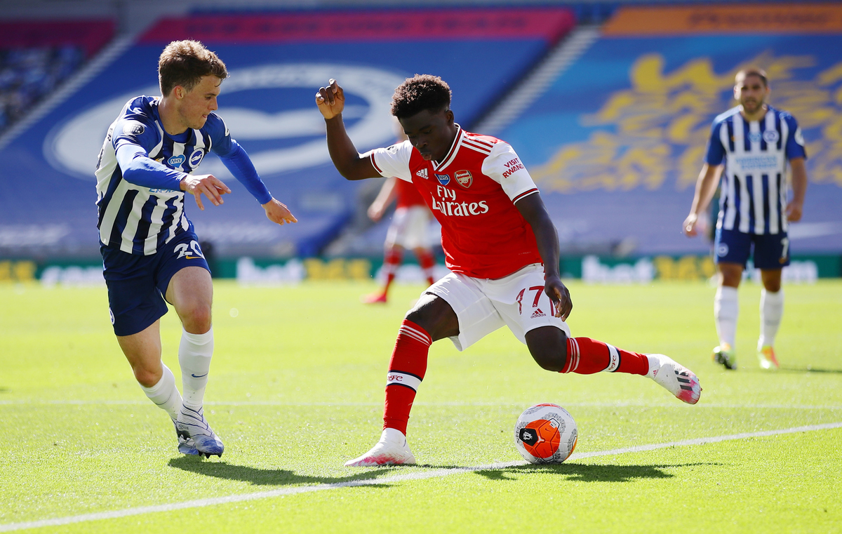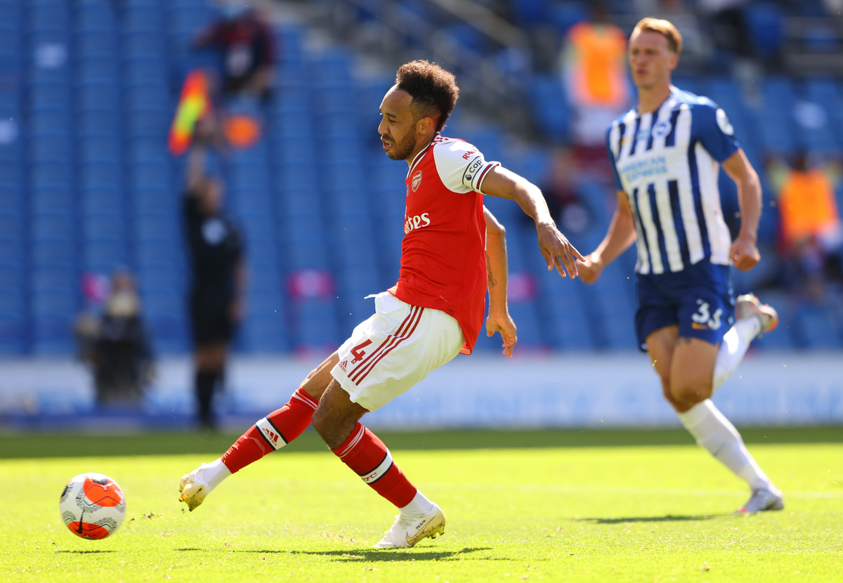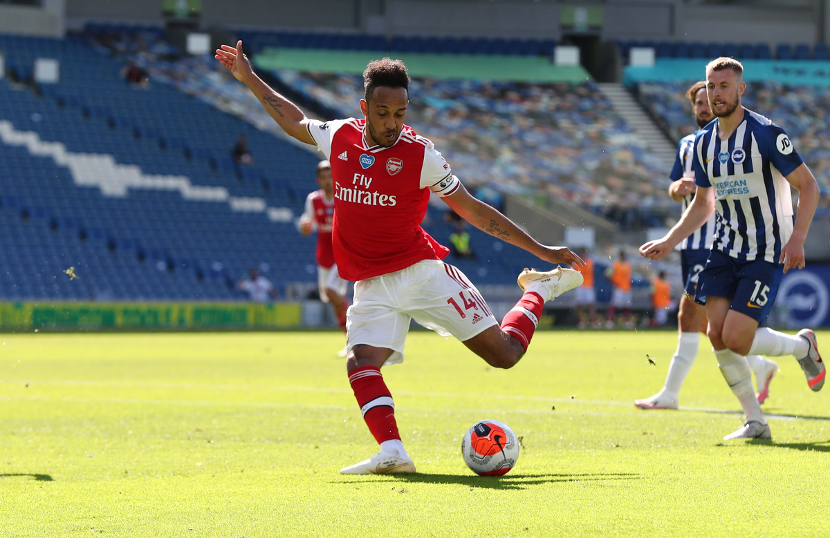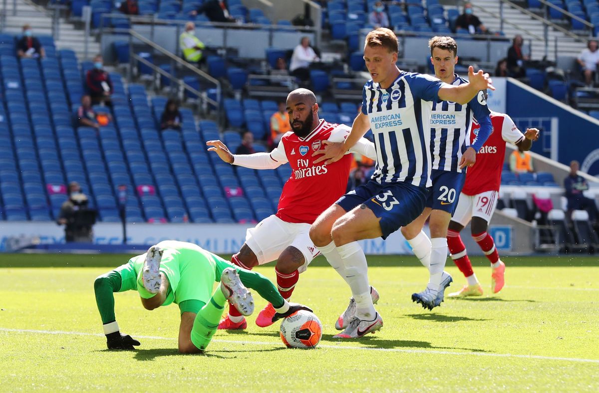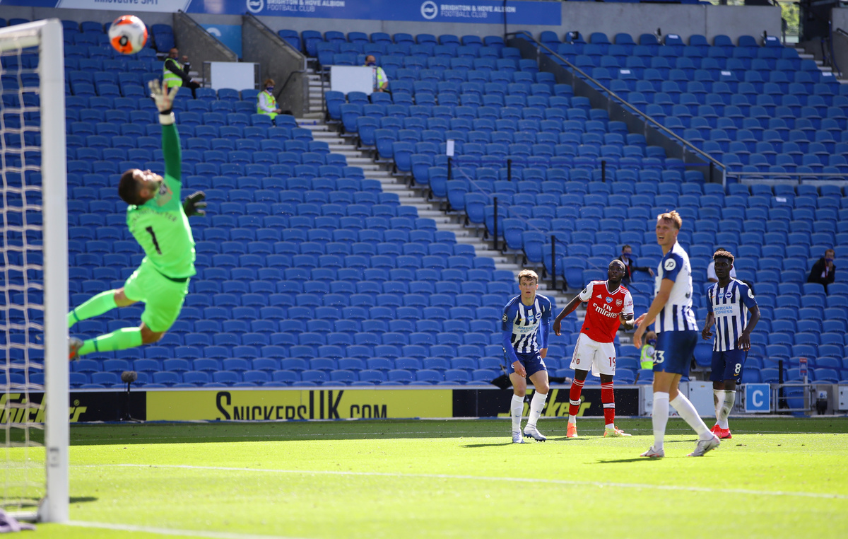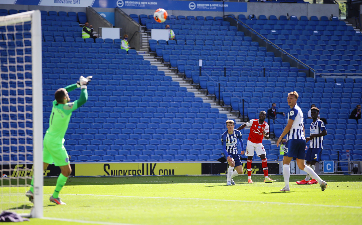 Soccer Football - Premier League - Brighton & Hove Albion v Arsenal - The American Express Community Stadium, Brighton, Britain - June 20, 2020 Arsenal's Bukayo Saka in action with Brighton & Hove Albion's Solly March as play resumes behind closed doors following the outbreak of the coronavirus disease (COVID-19) Richard Heathcote/Pool via REUTERS Soccer Football - Premier League - Brighton & Hove Albion v Arsenal - The American Express Community Stadium, Brighton, Britain - June 20, 2020 Arsenal's Pierre-Emerick Aubameyang shoots at goal as play resumes behind closed doors following the outbreak of the coronavirus disease (COVID-19) Richard Heathcote/Pool via REUTERS Soccer Football - Premier League - Brighton & Hove Albion v Arsenal - The American Express Community Stadium, Brighton, Britain - June 20, 2020 Arsenal's Nicolas Pepe scores their first goal as play resumes behind closed doors following the outbreak of the coronavirus disease (COVID-19) Richard Heathcote/Pool via REUTERS Soccer Football - Premier League - Brighton & Hove Albion v Arsenal - The American Express Community Stadium, Brighton, Britain - June 20, 2020 Arsenal's Pierre-Emerick Aubameyang scores a goal which is later disallowed following a VAR review as play resumes behind closed doors following the outbreak of the coronavirus disease (COVID-19) Richard Heathcote/Pool via REUTERS Soccer Football - Premier League - Brighton & Hove Albion v Arsenal - The American Express Community Stadium, Brighton, Britain - June 20, 2020 Brighton & Hove Albion's Mathew Ryan gathers the ball as Dan Burn and Arsenal's Alexandre Lacazette look on as play resumes behind closed doors following the outbreak of the coronavirus disease (COVID-19) Gareth Fuller/Pool via REUTERS