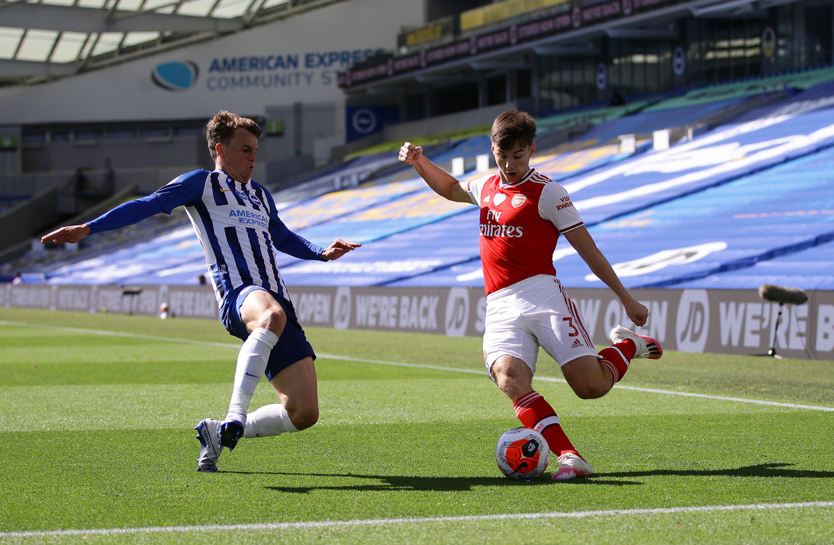 Soccer Football - Premier League - Brighton & Hove Albion v Arsenal - The American Express Community Stadium, Brighton, Britain - June 20, 2020 Arsenal's Kieran Tierney in action with Brighton & Hove Albion's Solly March as play resumes behind closed doors following the outbreak of the coronavirus disease (COVID-19) Richard Heathcote/Pool via REUTERS