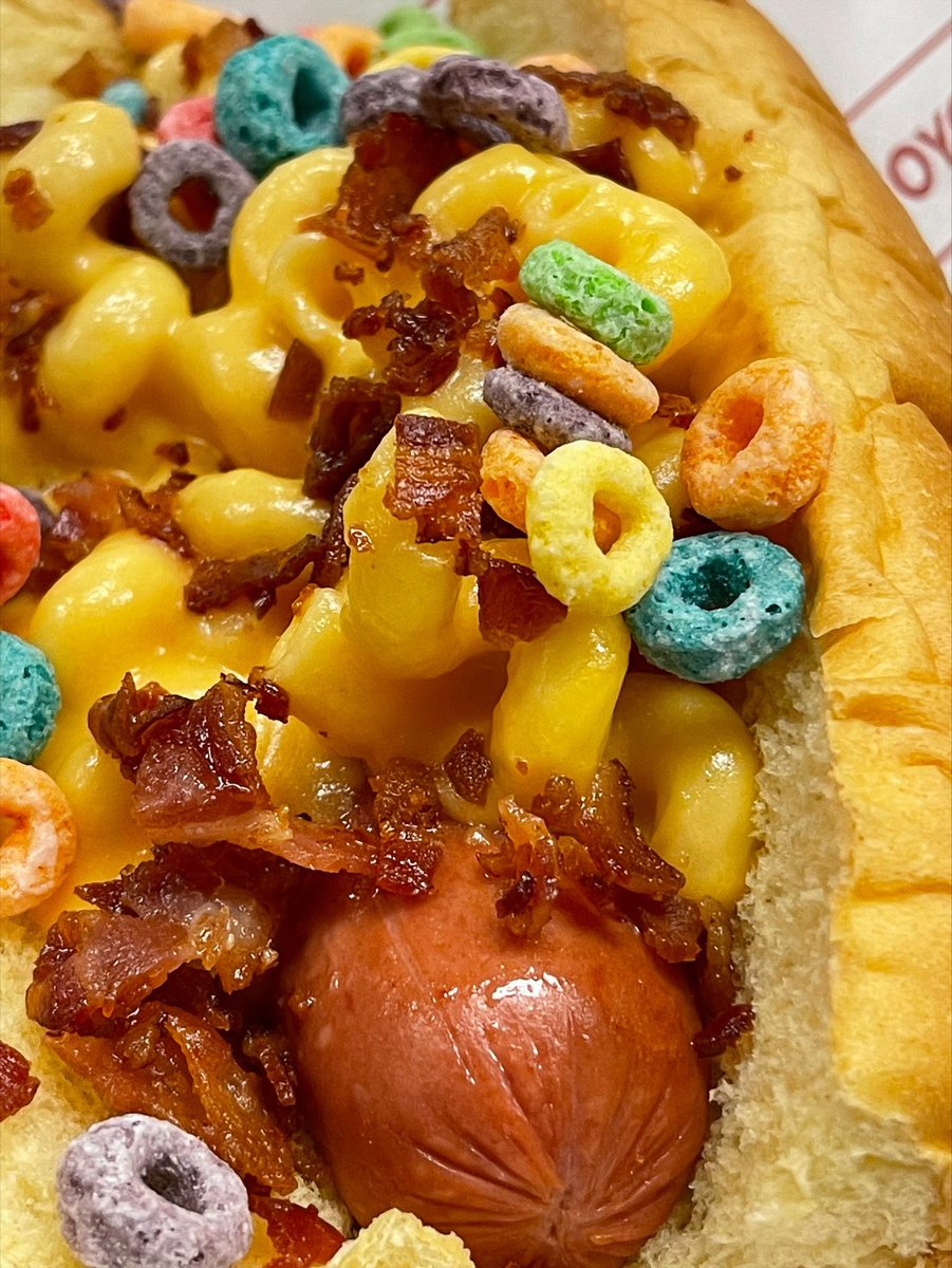 🌭 Jumbo mac ‘n cheese hot dog with fruit loops and bacon.