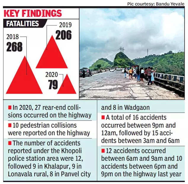 PUNE: Traffic moving towards Mumbai from Pune on the old Mumbai-Pune Highway (NH-48) saw a higher number of fatal road accidents near two points — Panvel city and Khopoli — in 2020, revealed a study by the NGO SaveLIFE Foundation, in collaboration with the Maharashtra State Road Development Corporation (MSRDC) and the Maharashtra highway police.