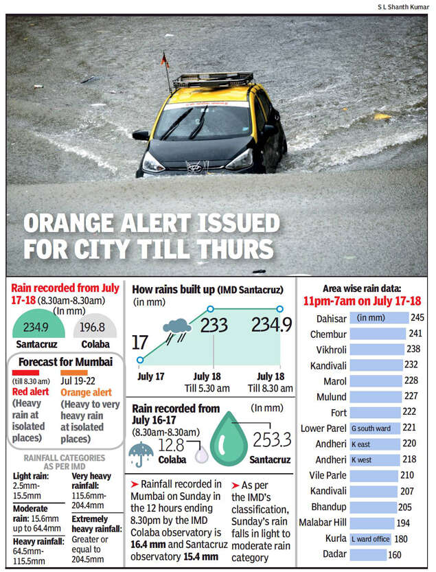 MUMBAI: Heavy rains battered the city overnight with a massive 200 mm recorded in a six-hour window between 11.30pm on Saturday and 5.30am on Sunday. The India Meteorological Department (IMD) issued a red alert for Mumbai at 7.45 pm on Sunday. The forecast will be valid till 8.30 am on Monday. It has sounded an orange alert from July 19-22, indicating heavy to very heavy rains at isolated places.