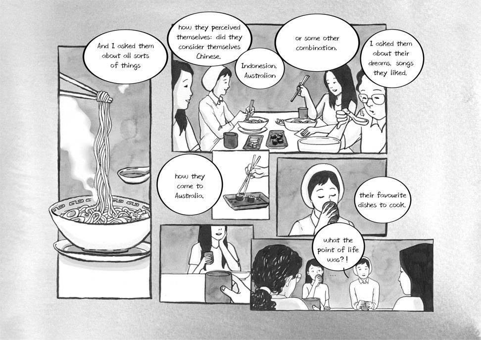 In the first chapter, Origins, Rani focuses on her cultural background as an Indonesian with Chinese roots, and tells the stories of her interviewees, who also migrated from Indonesia to Australia. She asks them how they came to be in the country and whether they identify as Chinese, Indonesian, Australian or otherwise.