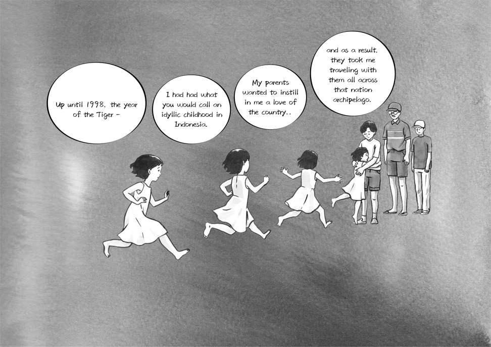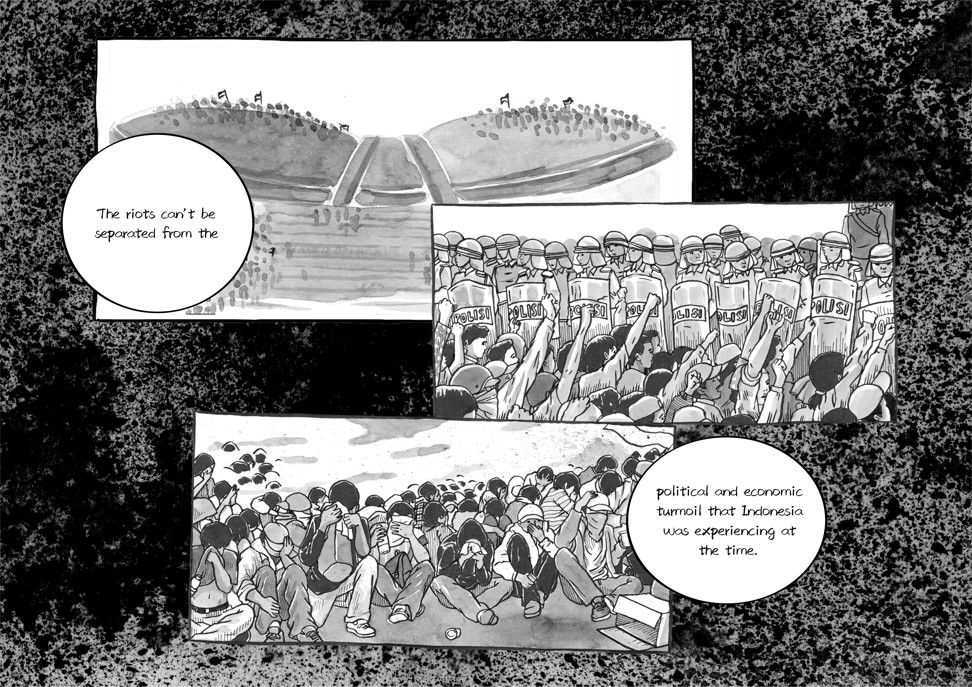 Illustrator Saja was nine years old when the 1998 riots broke out and remembers her family stockpiled sacks of rice at home because “they were worried about the situation at that time”.