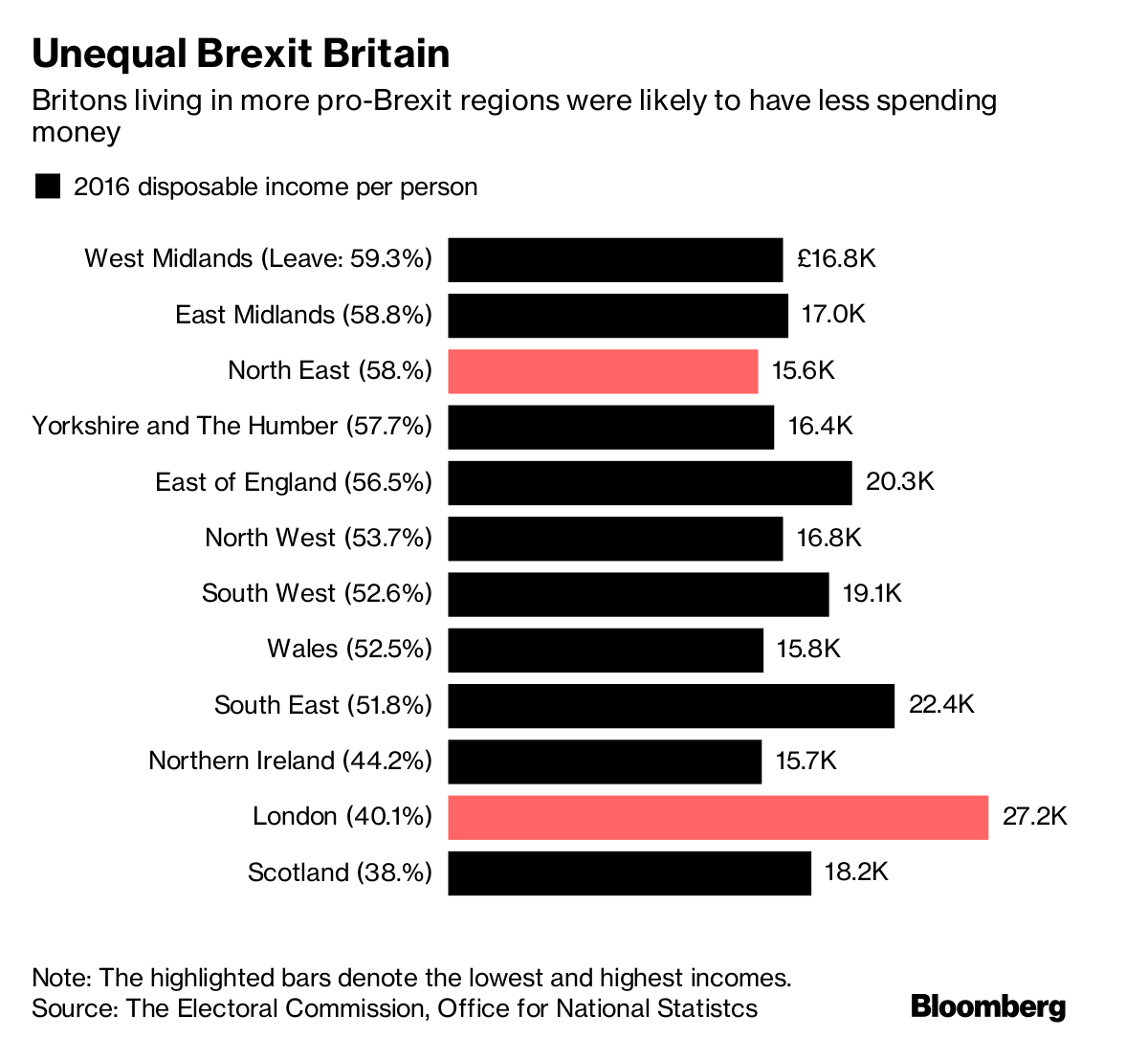 Support for Brexit was strongest in areas such as northeast England and the Midlands, which have some the highest unemployment and the lowest incomes in the country.