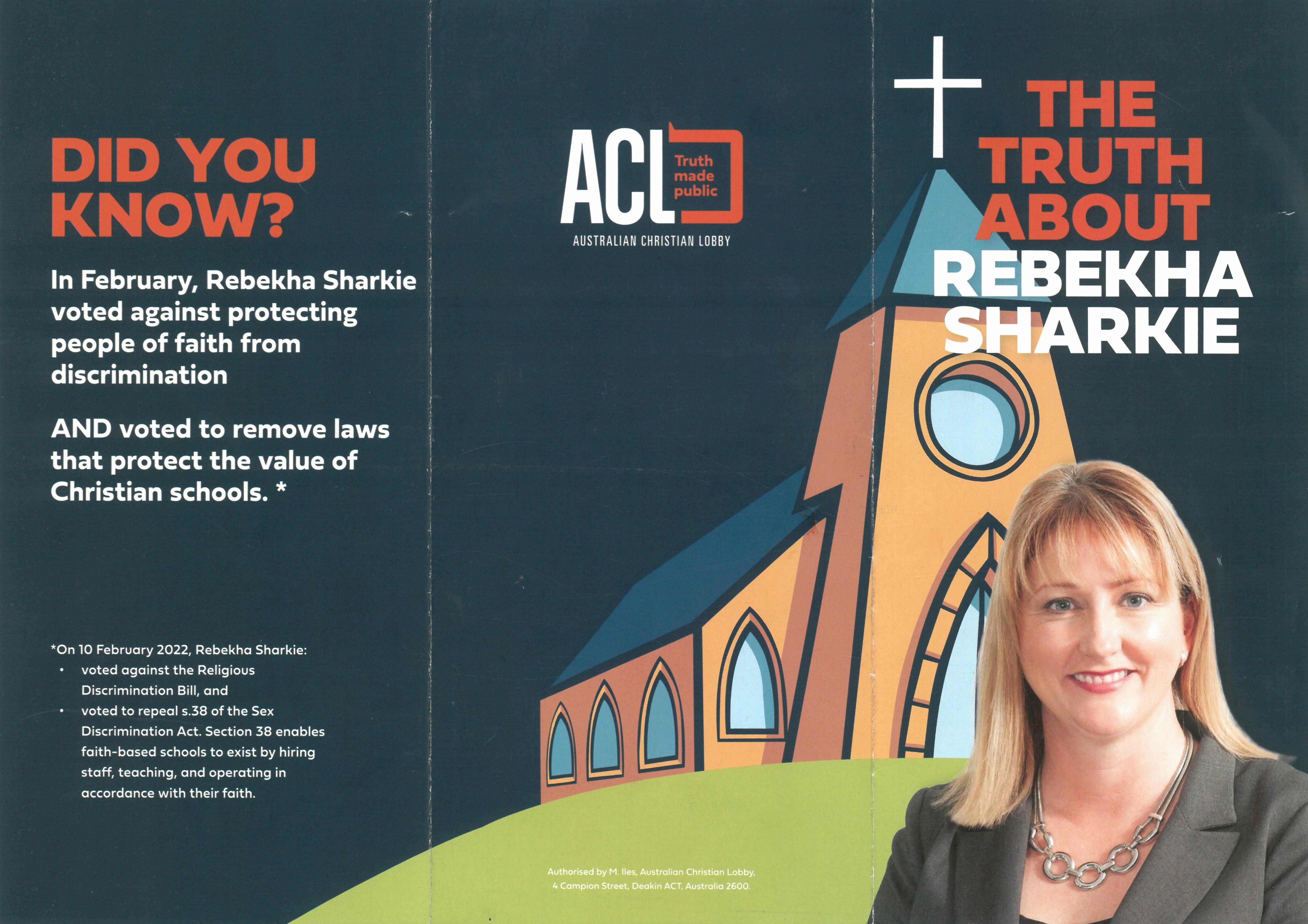 Ms Sharkie also said she believed it was inaccurate and unfair to see herself portrayed by the ACL as attacking Christianity or the church in the materials due to her position on the Religious Discrimination Bill.