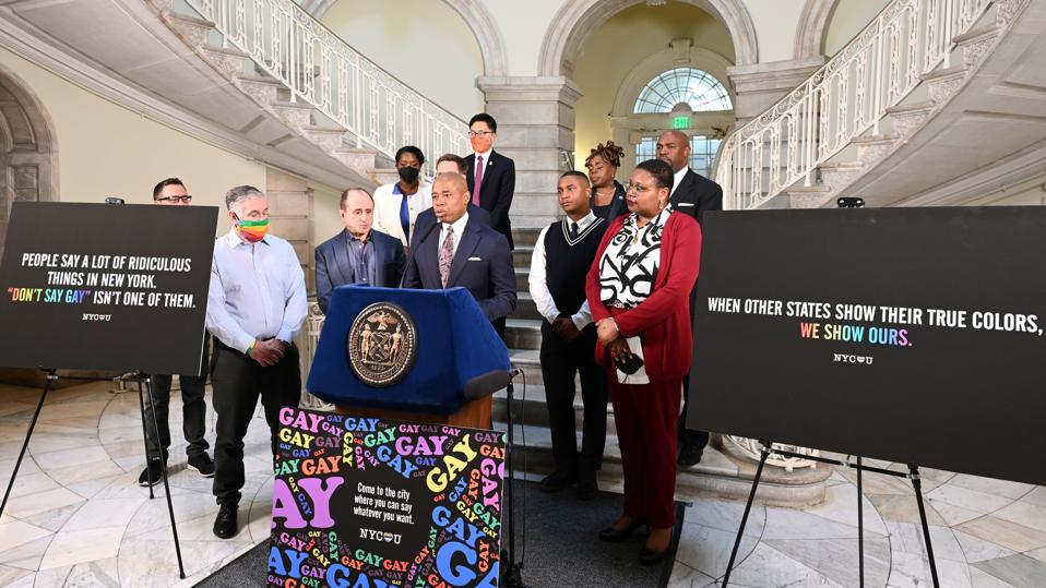 “We are going to loudly show our support and say to those who are living in Florida, you know, ‘We want you right here in New York City,’” Adams said at a press briefing Monday. “Other folks want people to hide their color, we want people to show their color, and that’s the rainbow that’s representative of this community.”