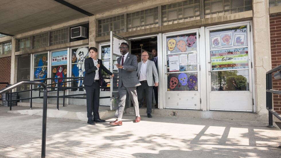 Brandon Johnson spent part of his first full day as mayor Tuesday visiting asylum-seekers who have been sleeping on the floor of the 12th District police station and others staying at a temporary shelter in Little Village, saying he needed to see the crisis “first-hand.”