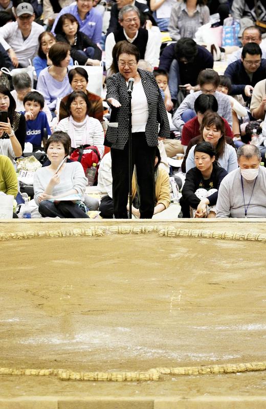"It's frustrating that I'm not allowed [to make this speech on the dohyo] because I'm a woman," said Tomoko Nakagawa, mayor of Takarazuka, Hyogo Prefecture, during a one-day visit to her city by the sumo tour.