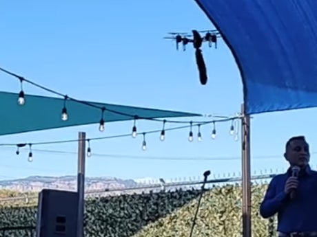 Video from the wild scene shows Mr Gonzales, a Democrat, being confronted by a demonstrator before a drone with a large dildo attached to it flies into view and hovers above the candidate's head.