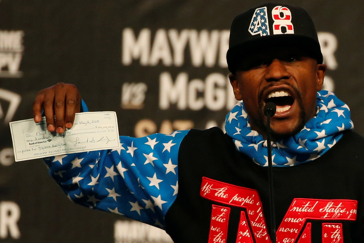 The cheque appeared to be the $100 million he earned for his victory over Manny Pacquiao two years ago.