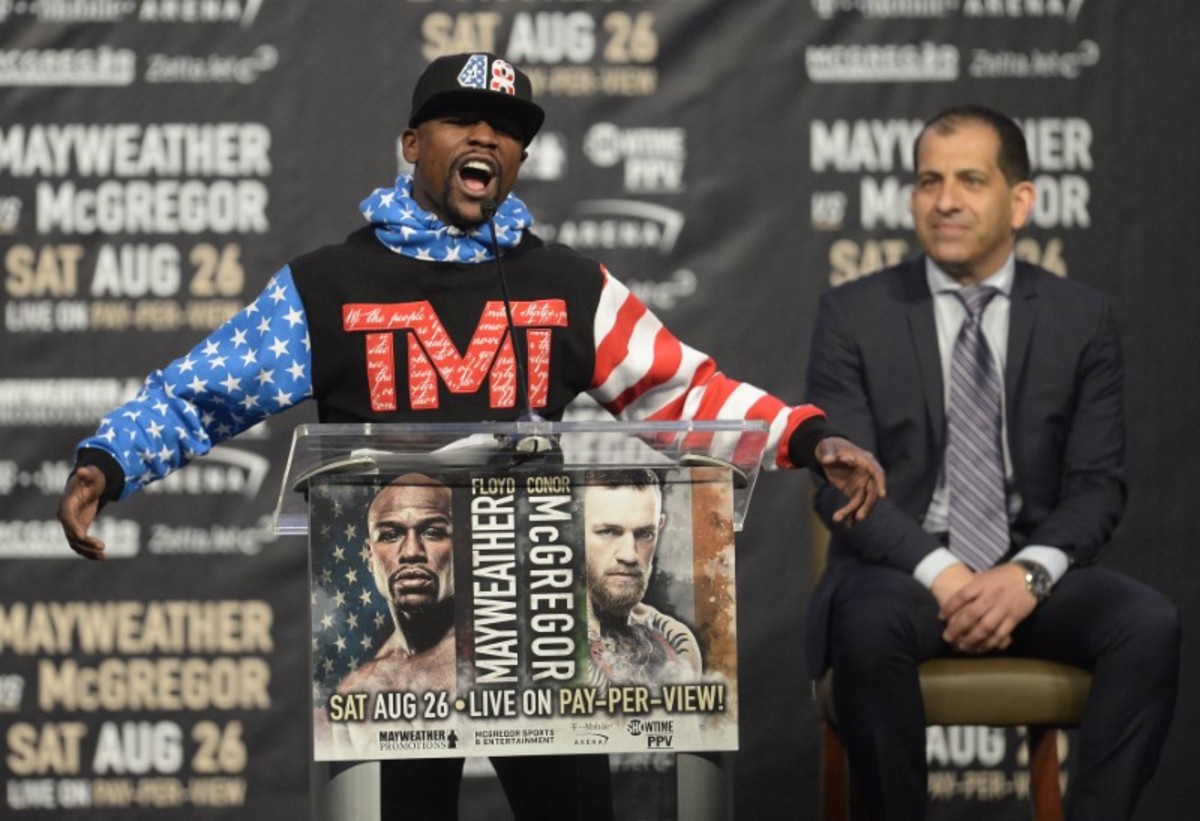 "He's upset, I've seen it before," Mayweather said. "And when these fighters get upset with me they come out and they try to kill me," he said with a laugh.