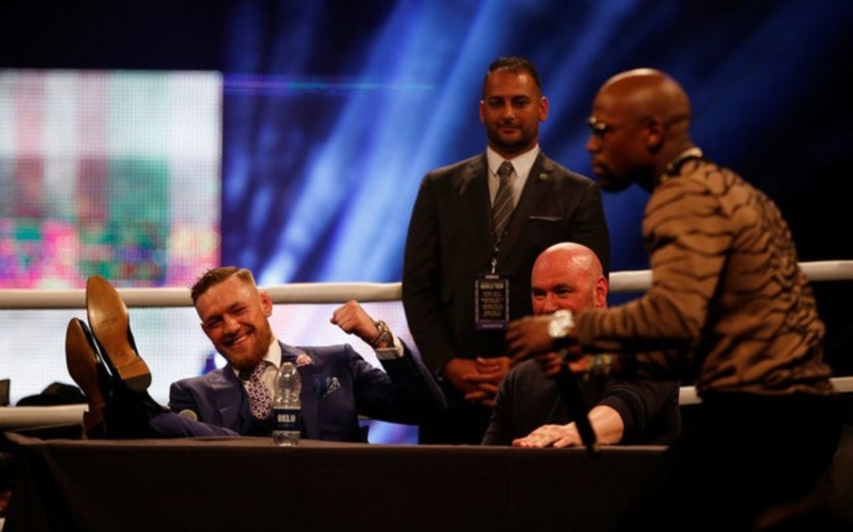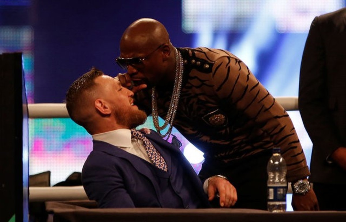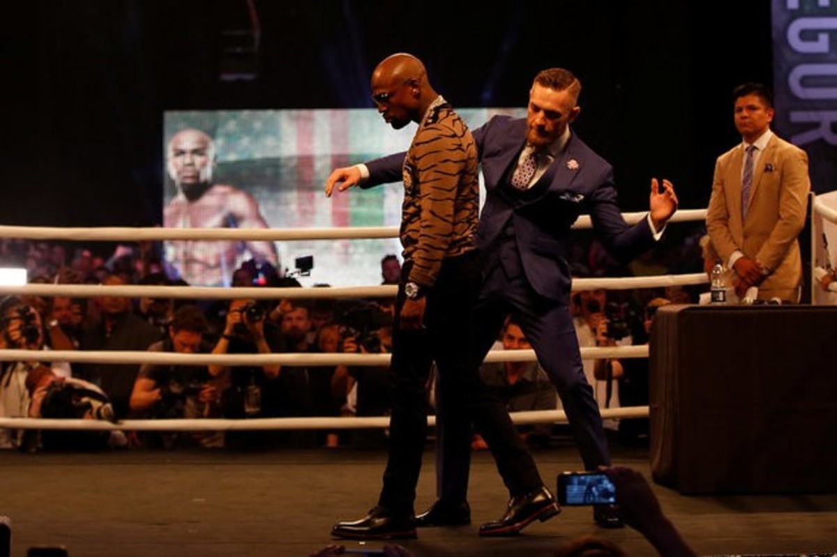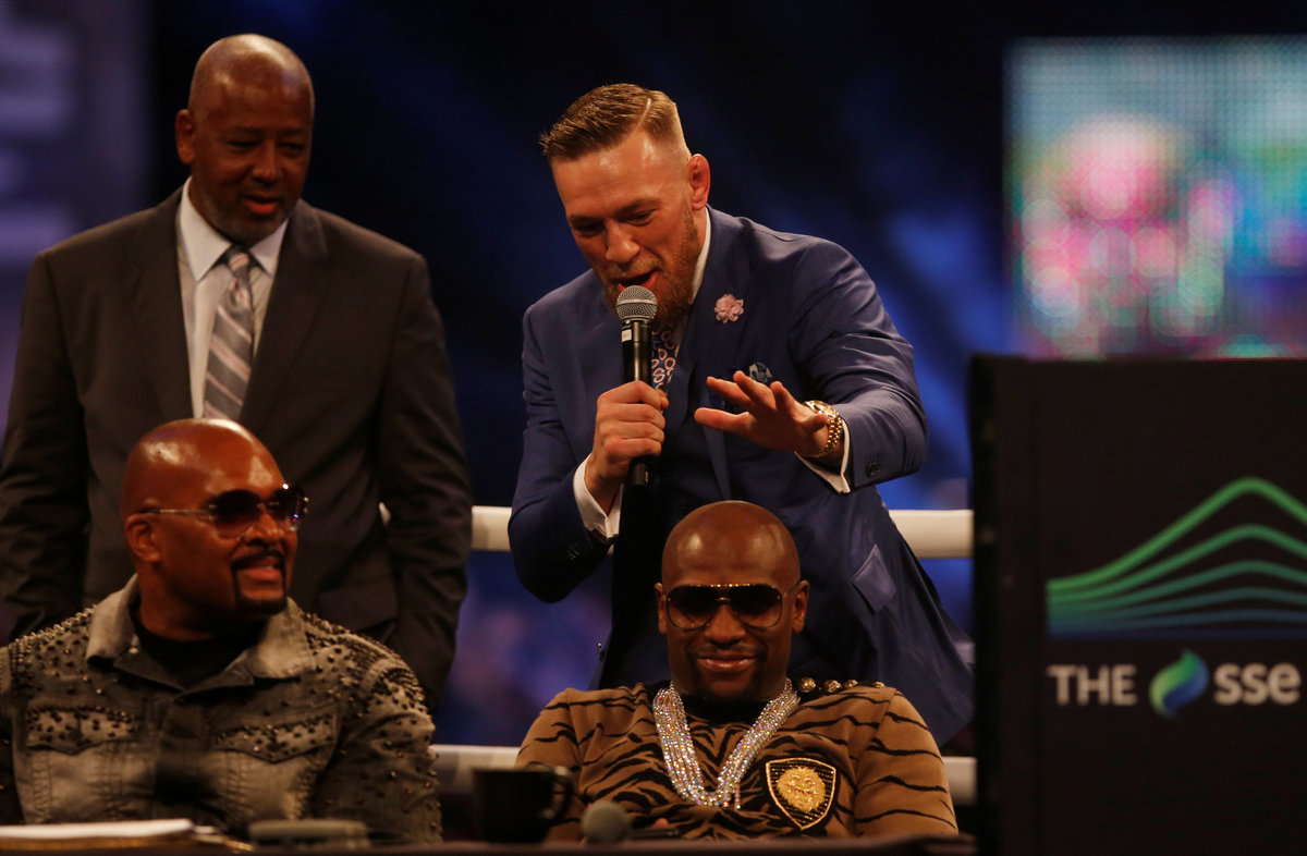 Celebrating his 29th birthday and wearing another sharp suit, McGregor once again spoke first, and he wasted no time firing insults at Mayweather and his team as he strutted around the three-sided boxing ring set up for the event.