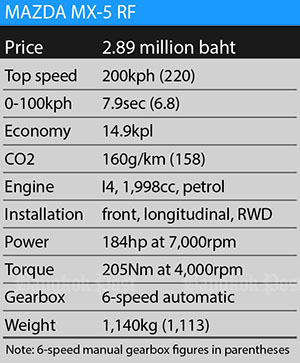 Both versions of the MX-5 RF, featuring a folding hard-top, cost the same at 2.89 million baht. This Mazda is without a direct rival in this country.