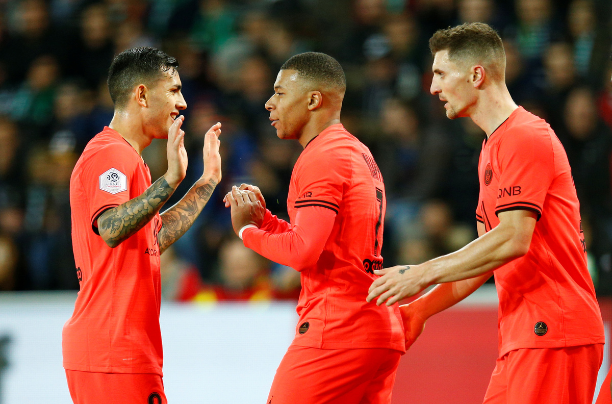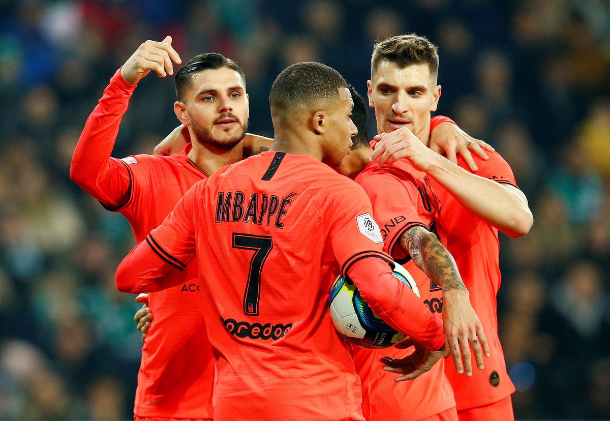 Soccer Football - Ligue 1 - AS Saint-Etienne v Paris St Germain - Stade Geoffroy-Guichard, Saint-Etienne, France - December 15, 2019 Paris St Germain's Kylian Mbappe celebrates scoring their second goal with teammates REUTERS/Emmanuel Foudrot