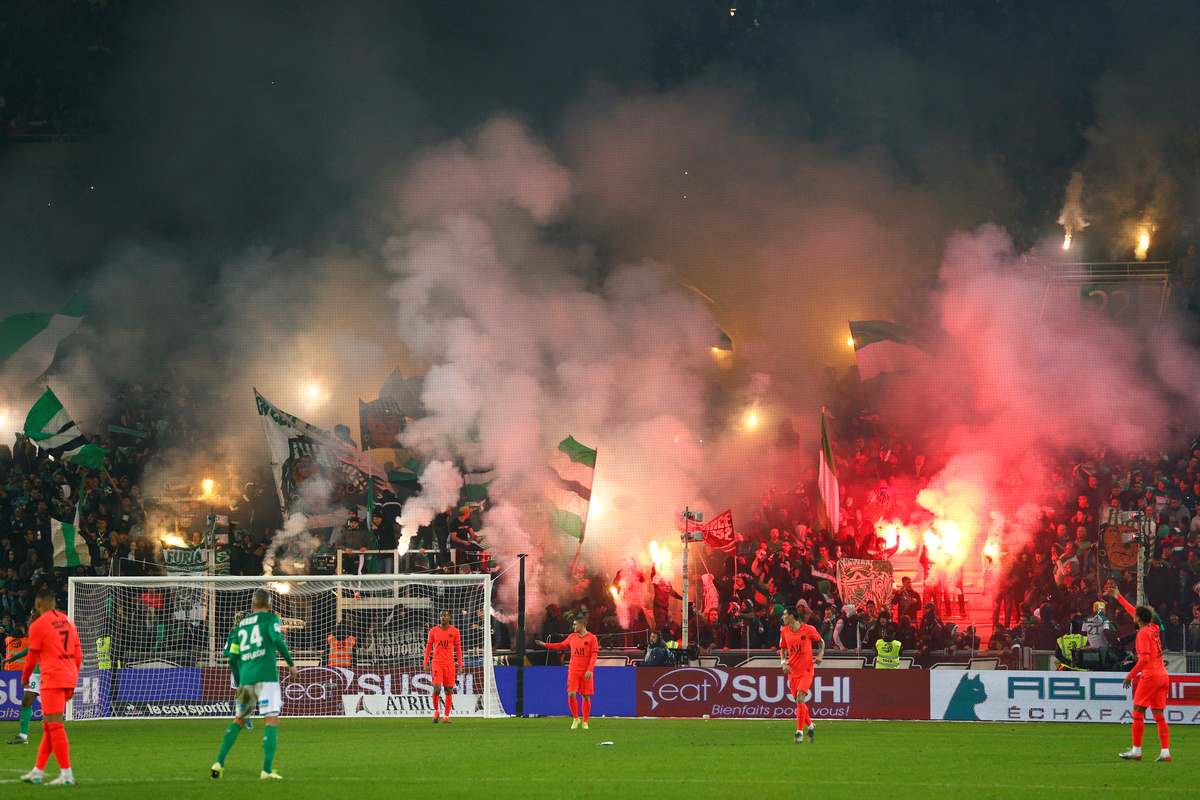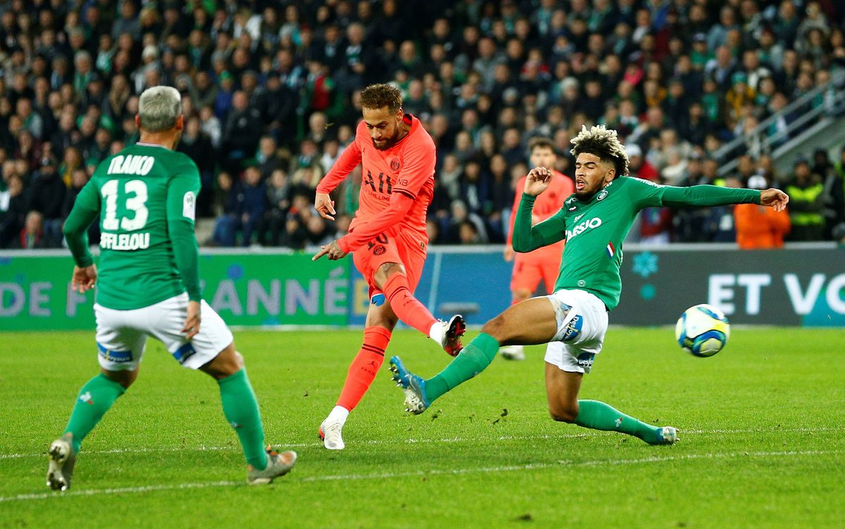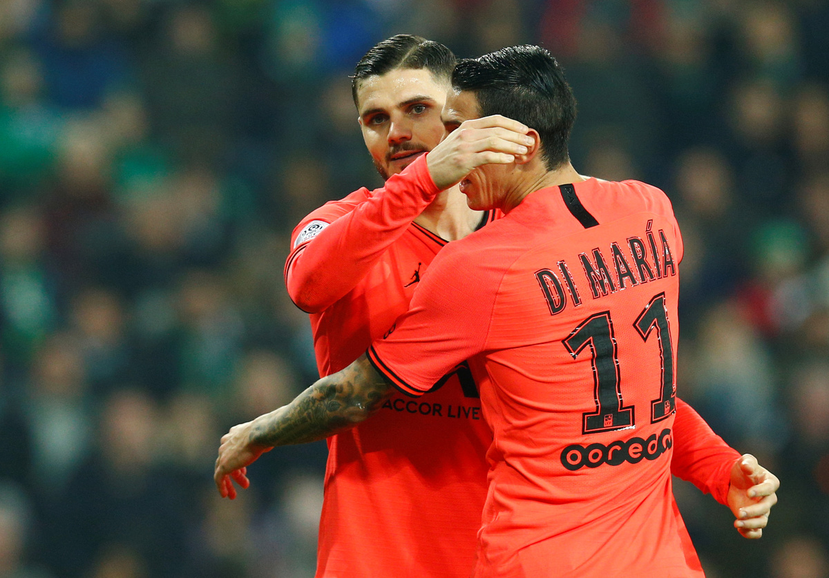 Soccer Football - Ligue 1 - AS Saint-Etienne v Paris St Germain - Stade Geoffroy-Guichard, Saint-Etienne, France - December 15, 2019 Paris St Germain's Mauro Icardi celebrates scoring their third goal with Angel Di Maria REUTERS/Emmanuel FoudrotSoccer Football - Ligue 1 - AS Saint-Etienne v Paris St Germain - Stade Geoffroy-Guichard, Saint-Etienne, France - December 15, 2019 Paris St Germain's Neymar shoots at goal REUTERS/Emmanuel FoudrotSoccer Football - Ligue 1 - AS Saint-Etienne v Paris St Germain - Stade Geoffroy-Guichard, Saint-Etienne, France - December 15, 2019 Paris St Germain's Mauro Icardi celebrates scoring their third goal with Kylian Mbappe and teammates REUTERS/Emmanuel FoudrotSoccer Football - Ligue 1 - AS Saint-Etienne v Paris St Germain - Stade Geoffroy-Guichard, Saint-Etienne, France - December 15, 2019 General view of fans with flares during the match REUTERS/Emmanuel FoudrotSoccer Football - Ligue 1 - AS Saint-Etienne v Paris St Germain - Stade Geoffroy-Guichard, Saint-Etienne, France - December 15, 2019 Saint-Etienne fans REUTERS/Emmanuel Foudrot