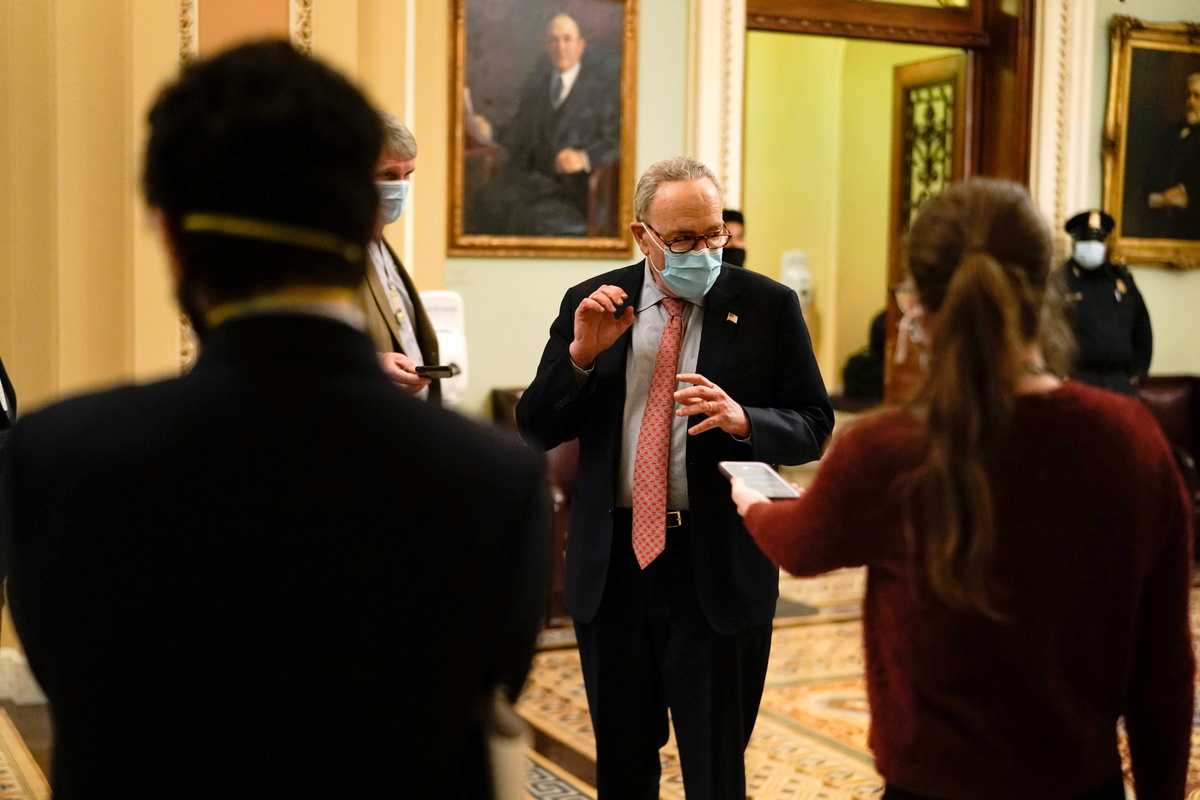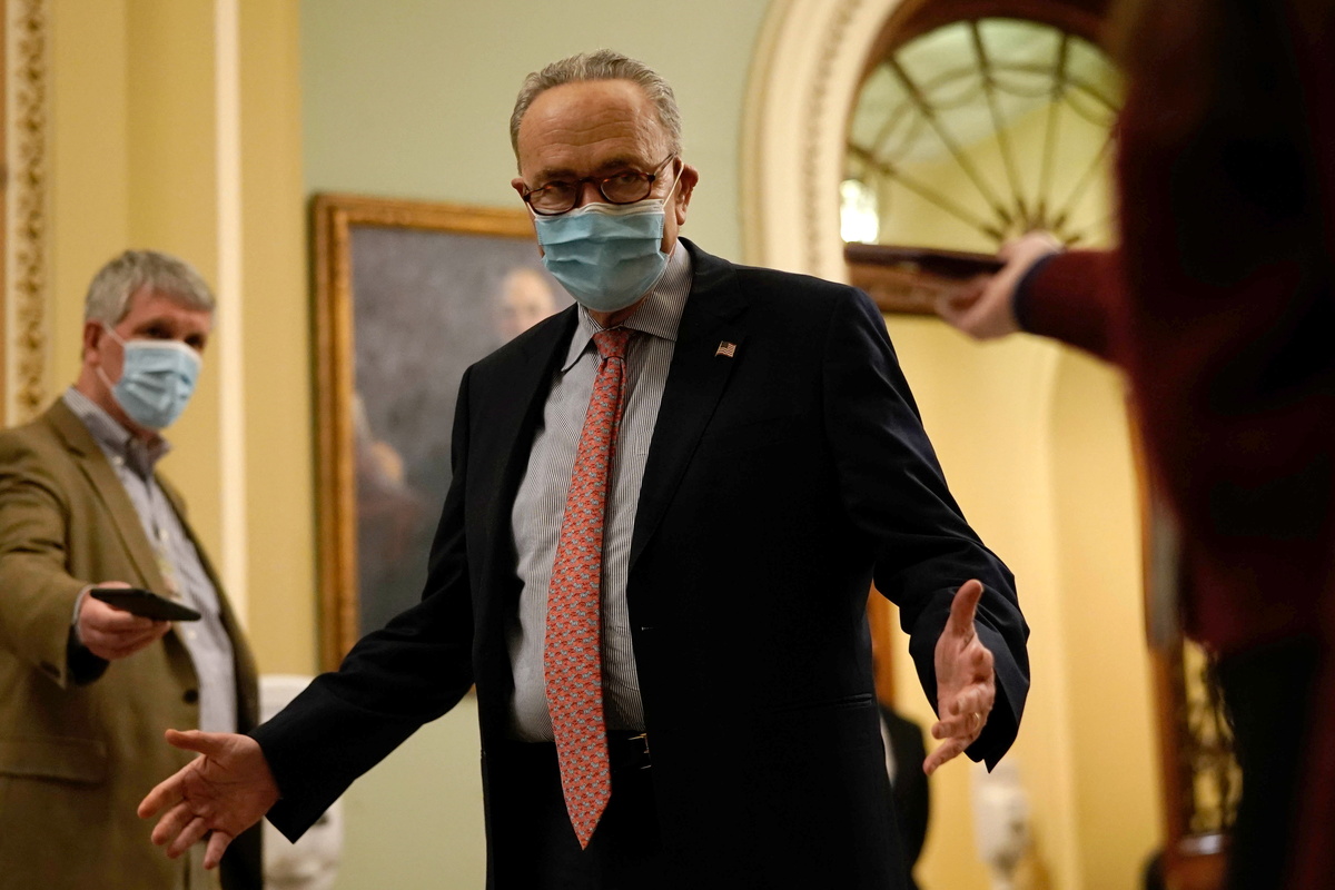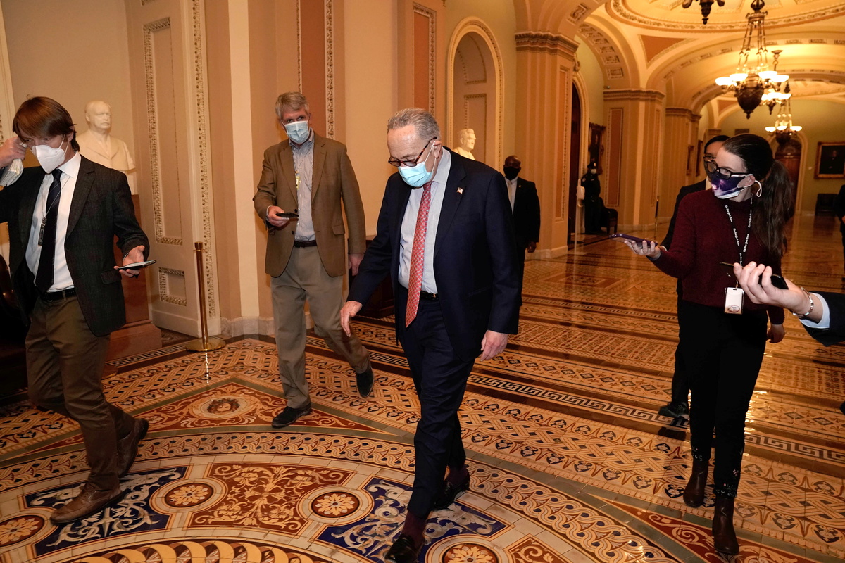Senate Minority Leader Charles Schumer, D-NY answers reporters questions saying there will likely be a Coronavirus disease (COVID-19) relief bill vote later on Capitol Hill Washington, D.C., U.S. Sunday, December 20, 2020. REUTERS/Ken CedenoSenate Minority Leader Charles Schumer, D-NY answers reporters' questions saying there will likely be a Coronavirus disease (COVID-19) relief bill vote later on Capitol Hill Washington, D.C., U.S. Sunday, December 20, 2020. REUTERS/Ken Cedeno