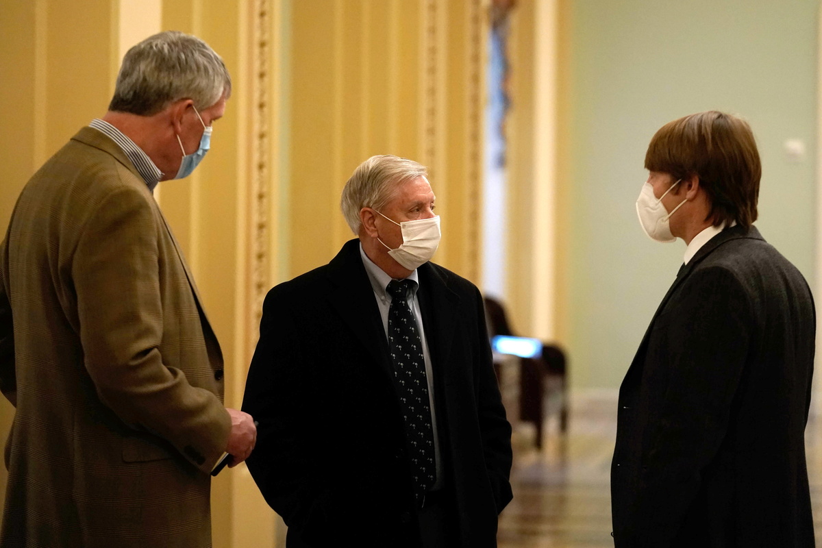 U.S. Sen. Lindsey Graham (R-SC), center, answers reporters questions on Capitol Hill Washington, D.C., U.S. Sunday, December 20, 2020. REUTERS/Ken Cedeno