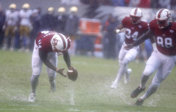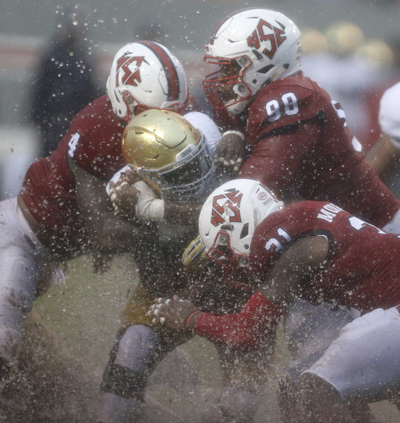 As expected under a steady downpour from kickoff through the final whistle, offense was scarce for both sides. N.C. State actually fumbled six times, recovering four of them, while Notre Dame had four fumbles, getting two back.