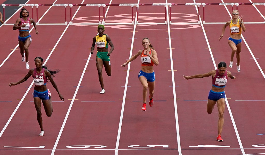 The day before, Karsten Warholm crushed his old world record, finishing the men’s race in 45.94, and runner-up Rai Benjamin’s 46.17 also beat the old mark.