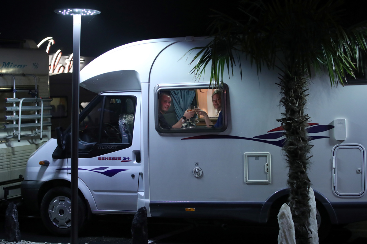 People can rent a vehicle or bring their own, park up outside the "Matthias and Sea" restaurant and wait for masked staff to bring the food over from the kitchens.