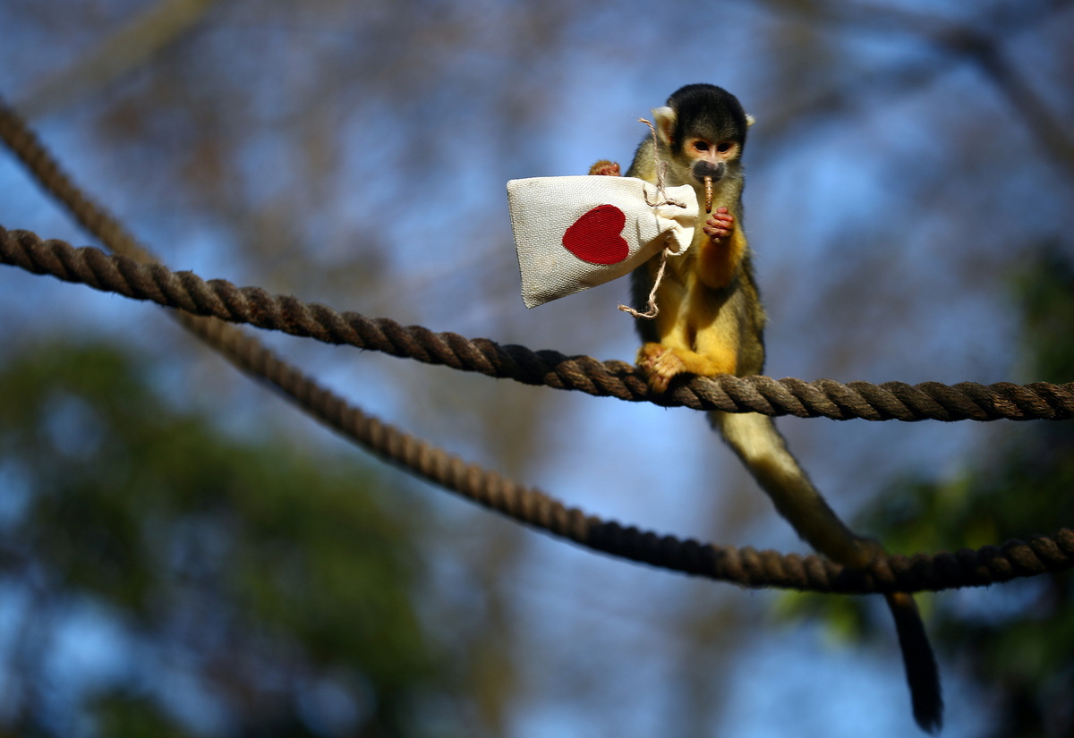 Staff at London Zoo have helped the leader of a squirrel monkey family keep his seven partners happy ahead of Valentine's Day with some special treats: heart-themed hessian bags filled with mealworms.
