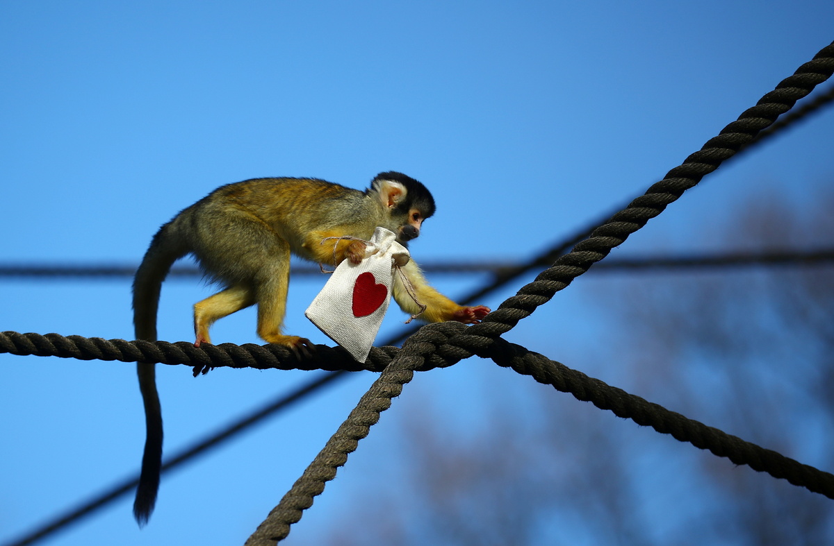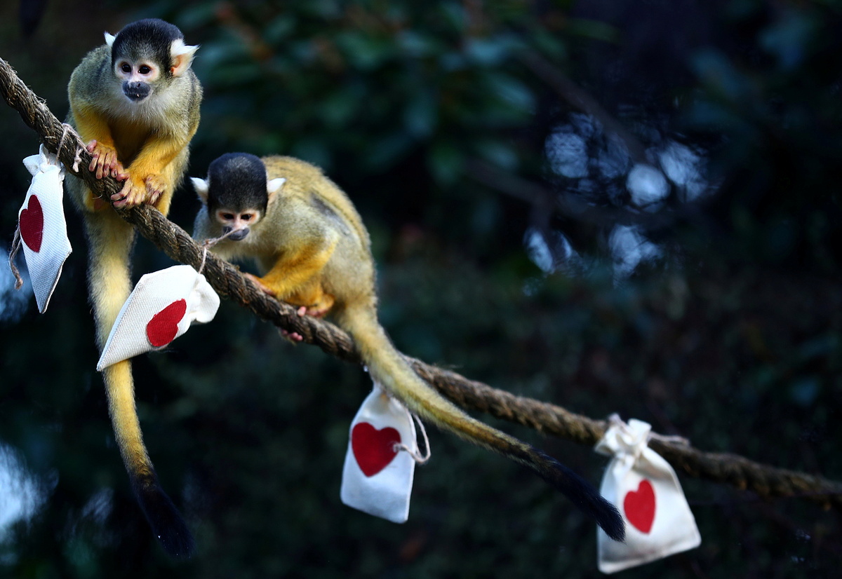 Black capped squirrel monkeys are fed treats from Valentines Day themed bags during a photo-call at ZSL London Zoo in London, Britain, February 10, 2021. Picture taken February 10, 20201. REUTERS/Hannah McKayBlack capped squirrel monkeys are fed treats from Valentines Day themed bags during a photo-call at ZSL London Zoo in London, Britain, February 10, 2021. Picture taken February 10, 20201. REUTERS/Hannah McKay