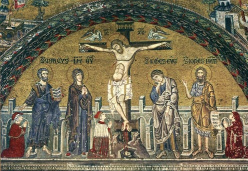 Three secular figures – a doge and two officers – are depicted as kneeling supplicants within a monumental mosaic of the crucifixion (see the main headline image above). Blending the sacred with the secular, this image offered an abstract “state portrait” that simultaneously expressed a political reality and suggested a new political ideal.