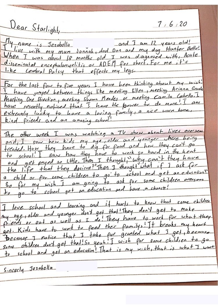 The Starlight Wish, through charity organisation Make-A-Wish Australia, grants a once-in-a-lifetime wish to children between the age of 2 and 18 who have a serious illness.