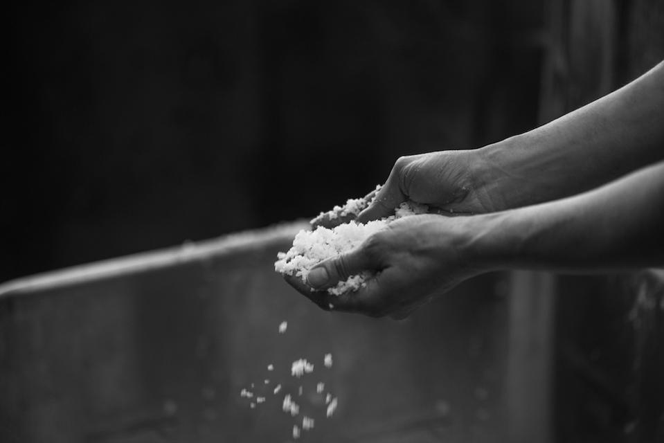 Iceland, the land of fire and ice, is a hot spot for geothermal activity, which is used to generate electricity. Saltverk’s unique location allows them to take water from the pristine Westfjords and turn it into sea salt using only geothermal energy. They use hot geyser water (206 degrees Fahrenheit) from the springs of Reykjanes to pump the saltwater into open pans, where it is preheated and becomes a strong brine. Once the brine reaches a salinity level of 17 to 20 percent, it’s boiled until salt crystals appear on the surface. The salt crystals sink to the bottom of the salt pans when they become too big and heavy to float on the surface, and then they’re harvested. Any remaining liquid is drained, then the salt is dried and packaged by hand.