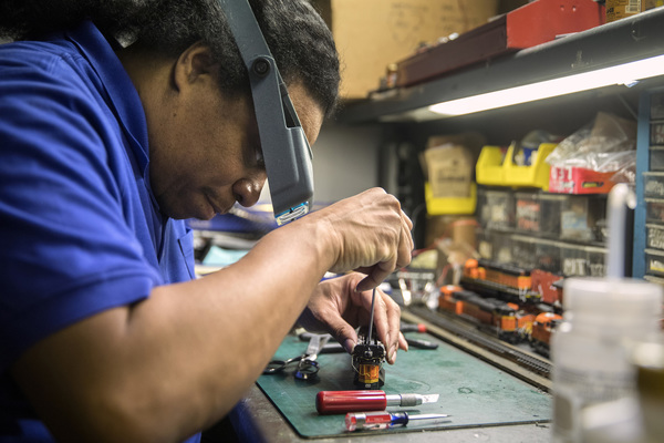 There are no computers to run any part of the train set at the museum. This is a very tactile room. Rows of drawers hold pieces of trains. There are cans of oil and air-dusters. Engines sit in stacks. There are freight cars and flatbeds with farm tractors and silver Amtrak engines and CTA cars. Davidson's hands are scrunched close to his face. His eyeballs are comically large behind his magnifying eyeglasses, outfitted with pen lights at the temples. He was operating on a derailed train. "It's an investigation," he said. "Something's throwing it off track. It's derailing by the apple orchard, all day long."