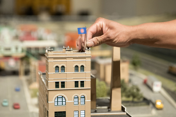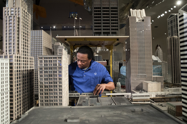Or rather, a Chicago entirely south of the Chicago River. (There is no Marina City or Trump Tower or Wrigley Field here and probably never will be, Llewellyn said.) Davidson opened a panel and the city's lights came on. When his term started, Davidson said the lighting in downtown Chicago was awful. He brought mercury-ish lights to factories, and cooler lights to the taller, more modern structures. Willis Tower received a pair of blinkers on the top of its antennae (and seasonally appropriate lights for holidays). He ordered a lot of new scenery: He started to add people to Chicago's streets, and more contemporary cars to its roads.