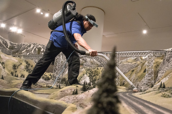 Davidson's first act as ruler, day in and day out, every day the museum is open, is to clean the nation himself, to maintain its roads and bridges and rails. It's part of his routine. Once a year the MSI hires an outside company to come in and give the USWD a deep clean, removing buildings and touching up the paint on scenery. But the rest of the time, it's Davidson. He grabs a bottle of denatured cleaning alcohol, a lint-free cloth and a polishing block that resembles a blackboard eraser. He works the block along every inch of the USWD's 1,450-feet of model railroad track, digging in deeply and running his rubber-gloved hand back and forth, starting in Seattle then moving to the Great Plains, and on toward Chicago, through coal country and back to Washington state. He cleans the tracks in segments that correspond to the individual power grids that run the nation.