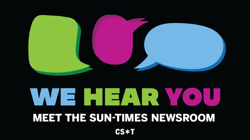 That’s why we’re running a series of community listening sessions — called We Hear You: Meet the Sun-Times Newsroom — in different neighborhoods and on different topics. At these sessions, you’ll be able to meet journalists in the Sun-Times newsroom — including Jennifer Kho, our executive editor — and let us know what stories and topics we’re missing, and ask any questions you may have for us about how the news works.