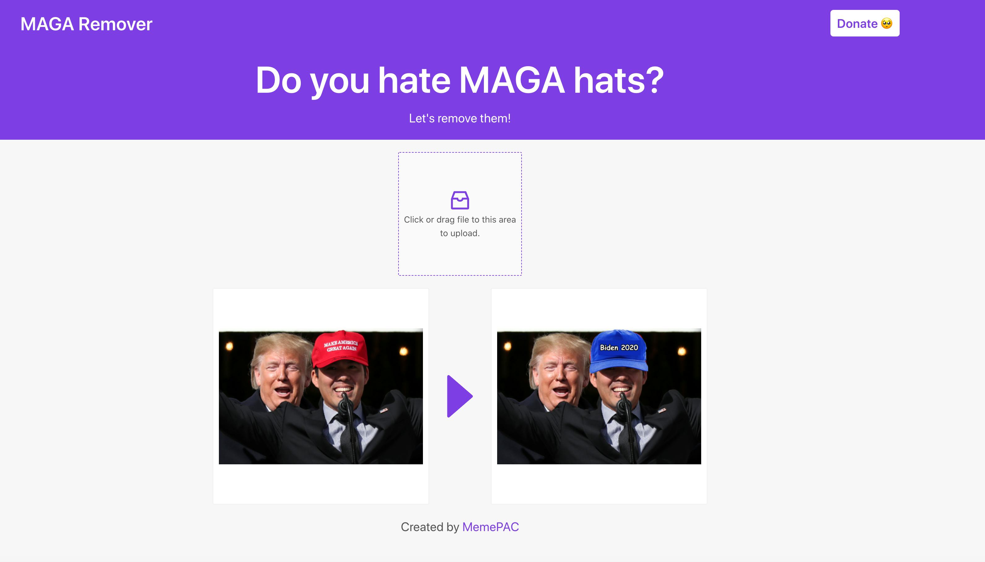 MemePAC's approach to politics is part of a growing trend of Zoomers tapping into memes to get their peers politically engaged. So far, it has created 19 different innovative and hilarious meme tools—from a translator that reinterprets Donald Trump’s toxic tweets into calming abstract art to a MAGA hat remover that allows users to replace photos of the red caps with blue “Biden 2020” ones. MemePAC also offers daily text messages and email blasts like “Trump Trivia,” which sends subscribers memes of “Trump's many mistakes every day until the election.”