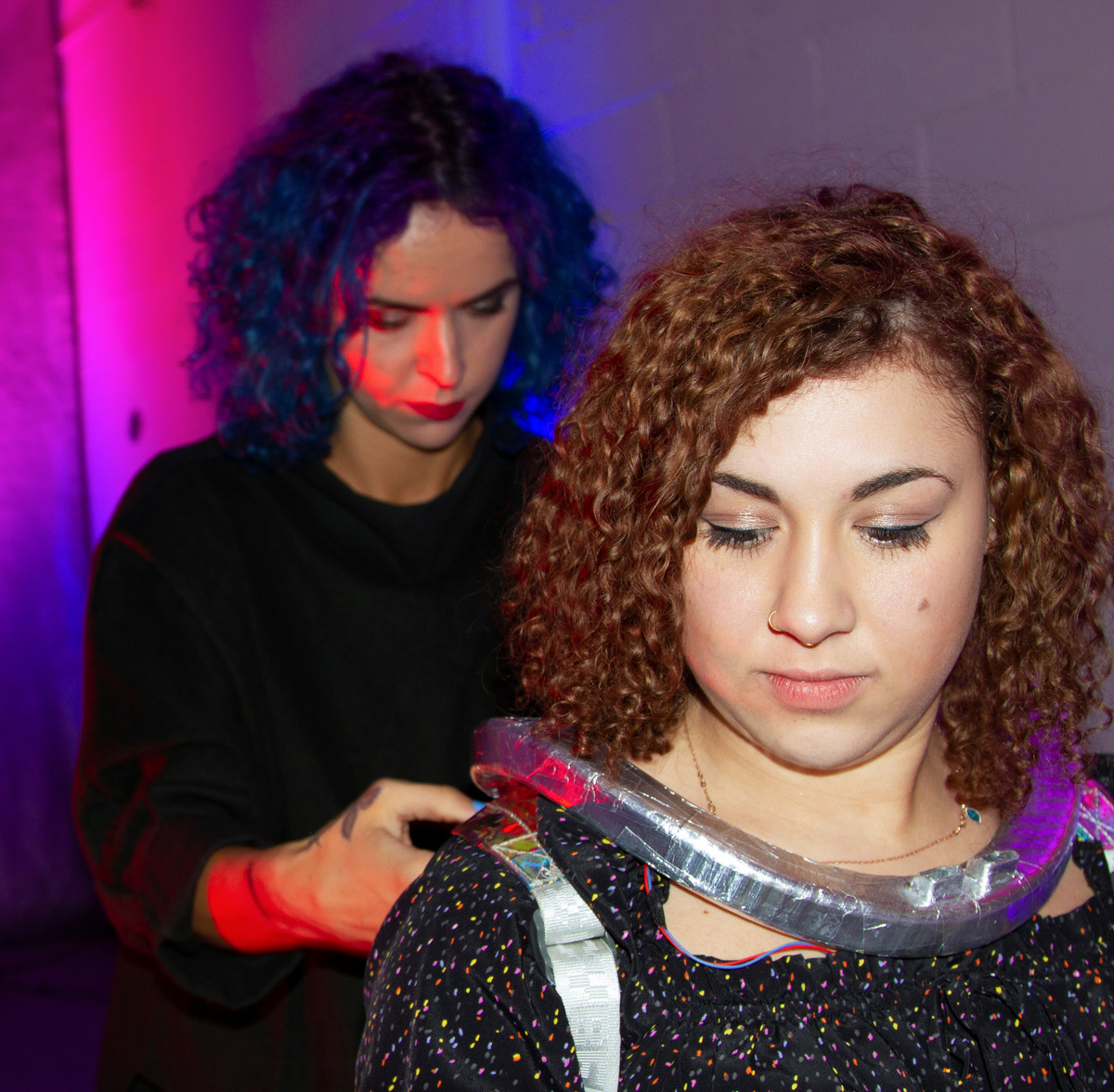In an industrial unit in North London two volunteers demonstrate her prototype experience combining virtual reality (VR), augmented reality and even smell, delivered through a collar worn around the neck, a head set, and hand-held sensors.