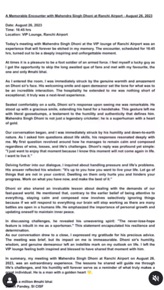 A CISF officer recently had a fanboy moment when he met his cricketing idol at the Ranchi airport. In a lengthy post the officer Satish Pandey shared his 'next-level experience' of his meeting with Dhoni.