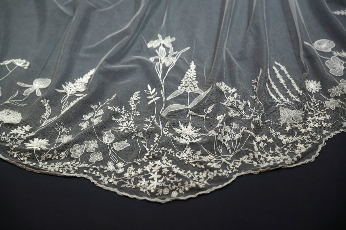 Visitors can see the veil's intricate embroidery up close as well as listen to the couple talk about preparing for their wedding day through an audio device, which also has a recording of Waight Keller describing her work on the bride's dress.
