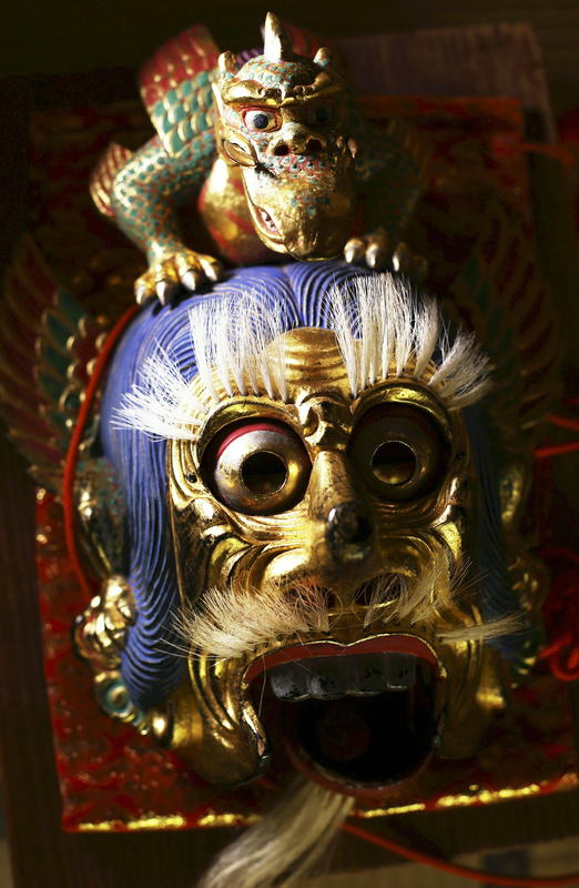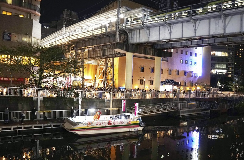 Ceremonial court music suggestive of ancient times echoed from a boat docked on the Meguro River, while dancers in brightly colored masks and attire moved elegantly, creating a mystical atmosphere for those watching from the road and a nearby bridge.
