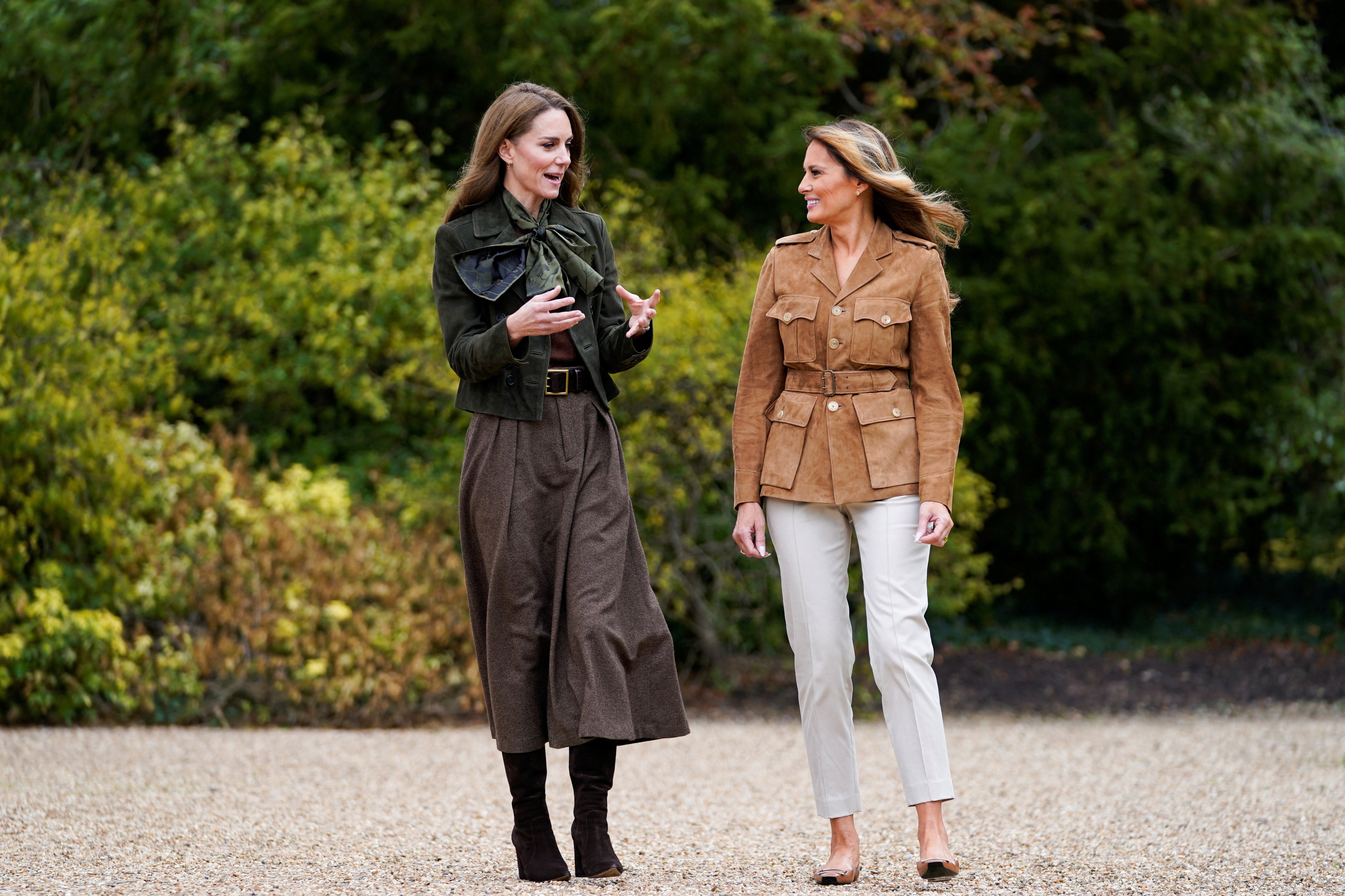 For the occasion, Kate wore a suede jacket and knit top from ME+EM with a long brown skirt, accompanied by a neck scarf and brown suede boots. Melania opted for a lighter-colored ensemble, with a belted tan jacket, beige slacks, and flats.