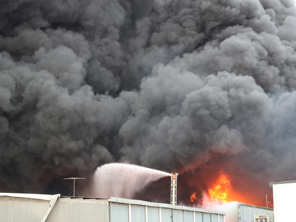 The warehouse contained aerosol cans and 44-gallon drums filled with grease, oil and acetone residues, and the fire took 17 hours to control.