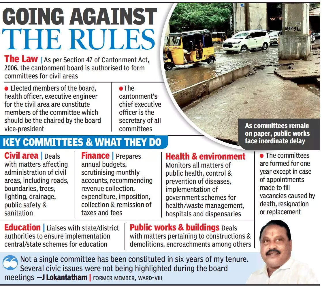 As per the Cantonment Act, the Secunderabad Cantonment Board (SCB) must set up six committees — business regulation, civil areas, education, health & environment, finance, public works & buildings — to ensure good governance but none of them have been formed.