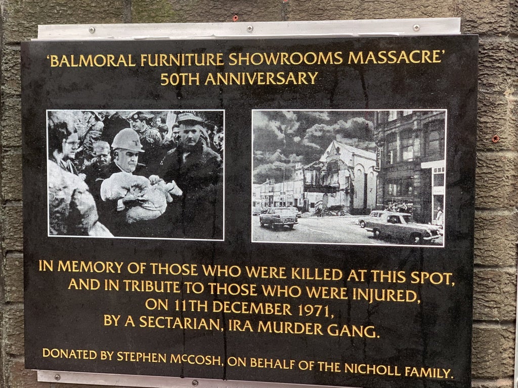 It read: “In memory of those who were killed at this spot, and in tribute to those who were injured, on 11th December 1971, by a sectarian, IRA murder gang.”