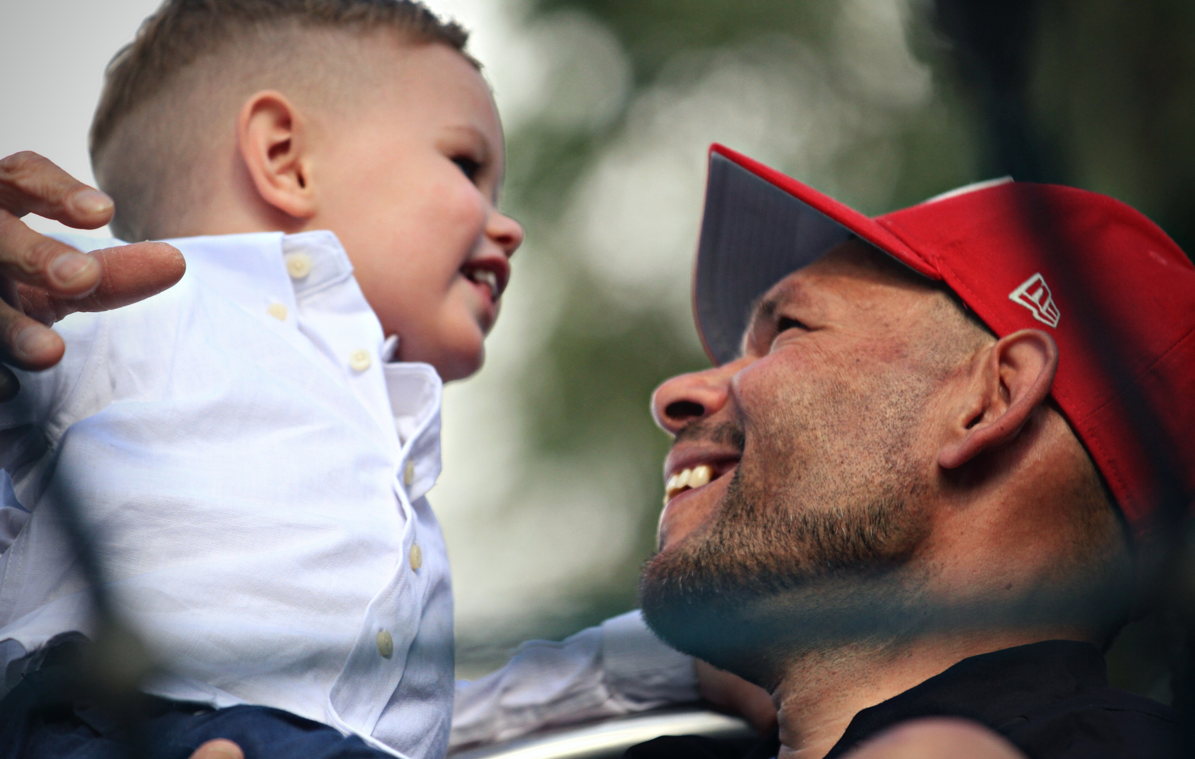 Dion is full of joy when he's chasing his girlfriend's son around the local park, climbing a jungle gym and pushing him on the swing.