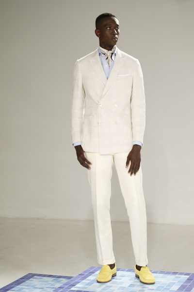 Michael Bastian's jazz-inspired collection was filled with a bevy of blue. The color was used as a pop when he incorporated a button-up with a khaki blazer or white seersucker jacket. He also used it as a focal point with a navy sweater adorned by a golden trumpet and with a number of sport coats, which could either be dressed up or worn casually.