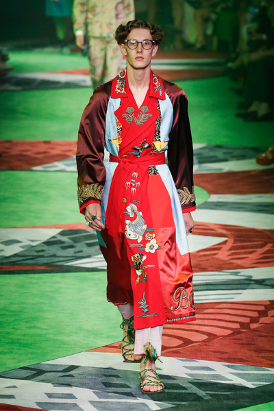 While it's not likely that many of these complete looks will be worn in everyday life, their influence will undoubtedly creep into the wardrobes of the straightest of straight men. For example, expect to see more men building their ensemble with layered pieces. And don't be surprised to see more men wearing looser, flared pants and capris.