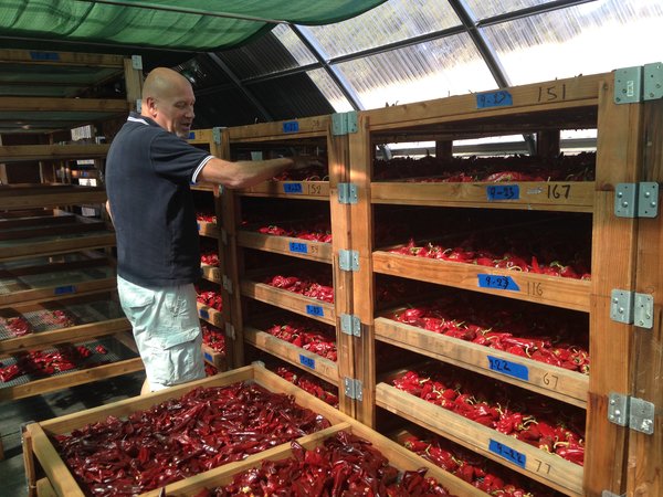 Once dried, the peppers go in a dehydrator, winding up "potato chip crisp," Scommegna says. They're ground and packed, with the vintage displayed on the label. Then they wind up in dishes such as the enormous paella the Table 128 crew produces on Sunday evenings in the summer and early fall and other prix-fixe family-style feasts served year-round _ and, if you're lucky, on your plate at home, too. (We're now dusting pretty much everything _ except cornflakes _ with piment these days.)