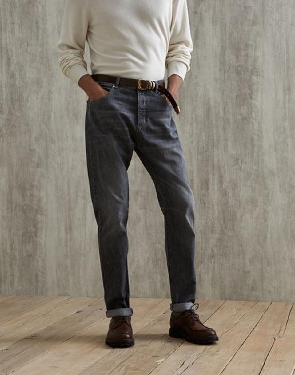 Brunello Cucinelli -The timeless style of the five-pocket silhouette is combined with Brunello Cucinelli’s refined materials. The finish of the grey cotton denim enriches the sporty look of these trousers, creating a worn effect that stands out for its unique characteristics and details making it a perfect elevated denim for the fall season. Their leisure fit offers soft proportions in the seat and a slightly low rise, while the cut of the leg remains close to the body. $1,075